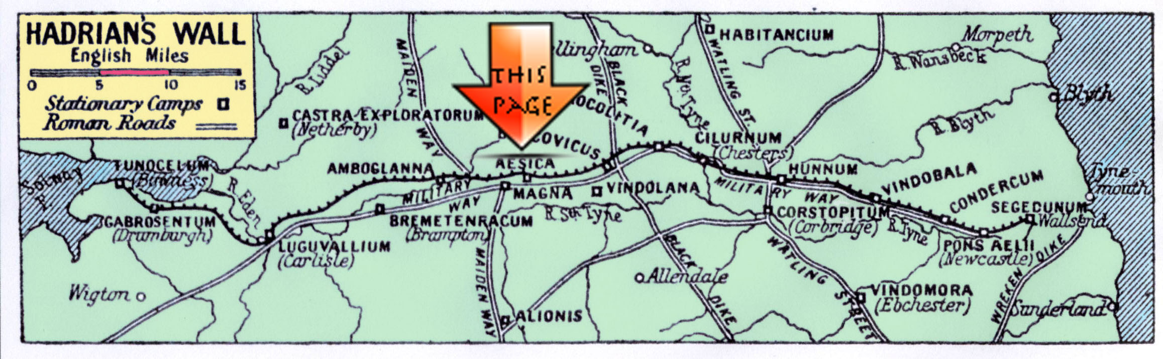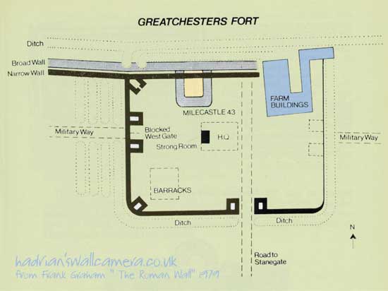 Milecastle 43 was already partly erected in accordance with the First Plan and once more the plan itself was ignored, the possibility of an eventual conjunction with the wall entirely disregarded. Here at Greatchesters to have built (the fort north wall) north of the Broad Foundation would have meant building on the berm between the Broad Foundation and the Fighting Ditch, and therefore on unstable ground. The substitute line selected by the fort's engineers was immediatly behind the Broad Foundation and ran directly through the east and west walls of the milecastle which was levelled to take it. *1 Greatchesters The Amiens skillet calls it "Esica" as does the Ravenna list. The Notilia calls it "AESICA" An area covered of about three acres. It is unusual in having a duplication of Ditches in its surrounds. Bruce, reminds us of an earlier discovery of an Aquaduct traced from the Caw Burn some two miles distant from the fort, over a distance of six miles, to come within a few hundred yards. There has been much speculation through the years regarding AESICA's place in the scheme of the wall. The debate centering around the north wall of the Fort and its integration and conjunction with the Defensive Wall at the NW corner. * "Everything about the northwest corner of Greatchesters suggests that, as at Housesteads, it was built in the certainty that the Broad wall was abandoned , in the belief that the fort would have to stand alone, and before the necessity with the Narrow Wall was considered.*2 Pictures and more information about the Fort on the next page. |