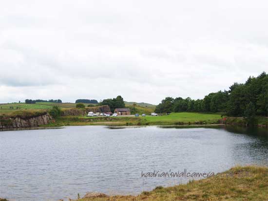 The Wall made its way along the top the now dissapeared ridge. The pond and the carpark now on the line and behind the restrooms there is a small hillock at the axis of the turn in the Wall taking the line down over theHaltwhistle Burn and up and on to AESICA Fort.