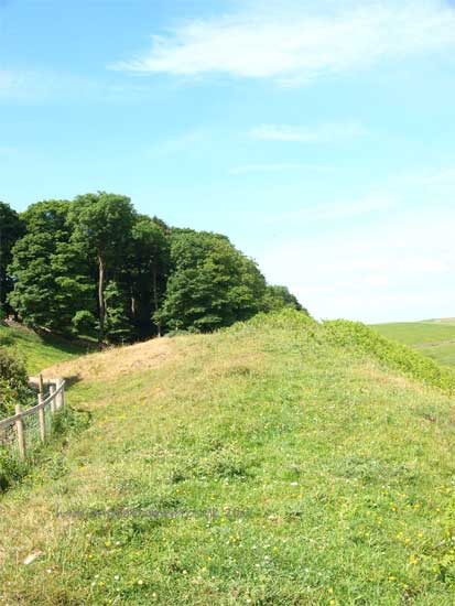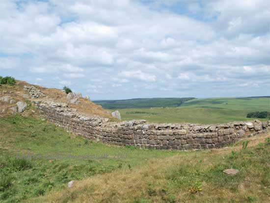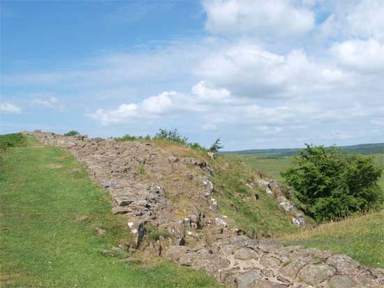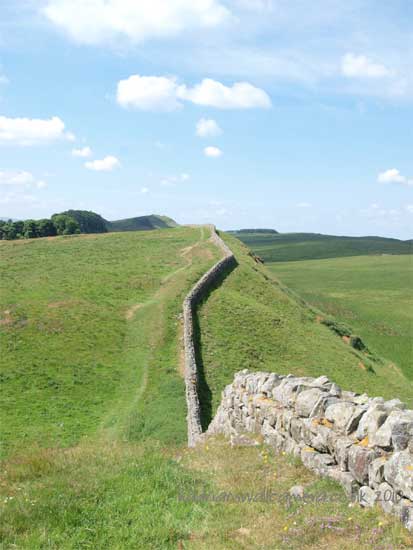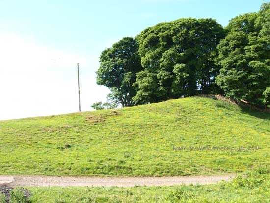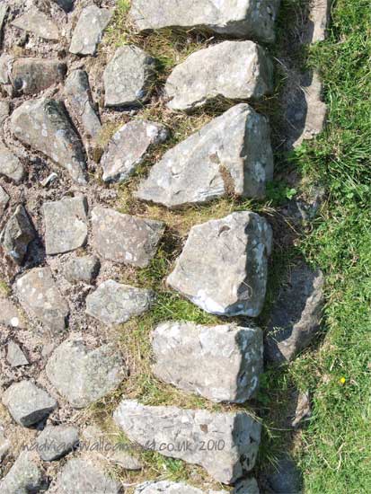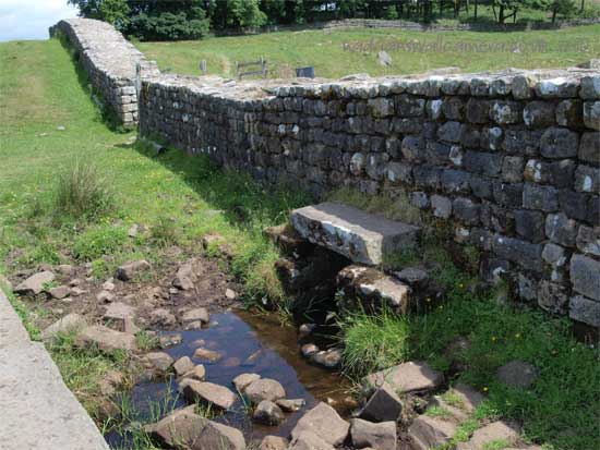 South of the wall was the Vallum, a complex consisting of a 20 ft ditch with a wide bottom section and mounds composed of spoil to north and south. The wall was built to the design width only on the eastern slope. The Milecastles built before the change of plan had 10ft wings on either side. The curtain wall as finally built was substantially narrower and the join is indicated in the diagram.