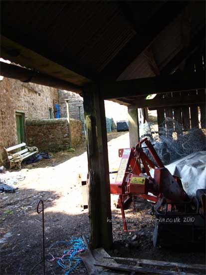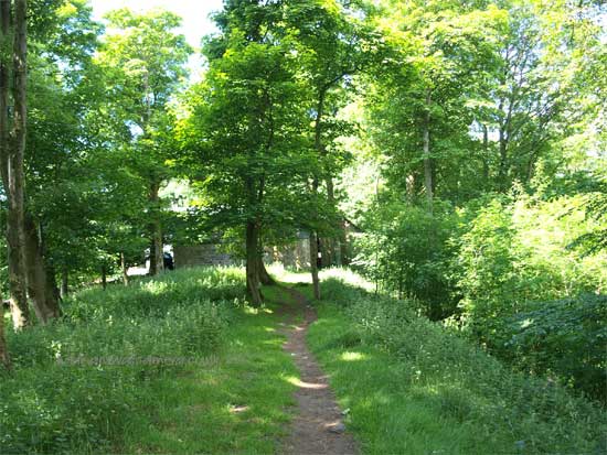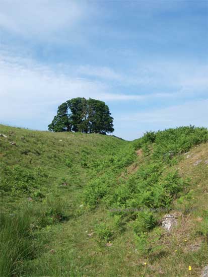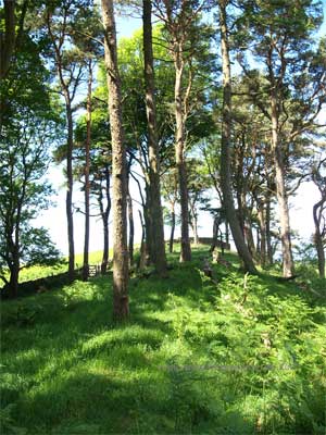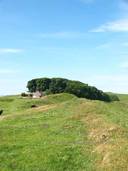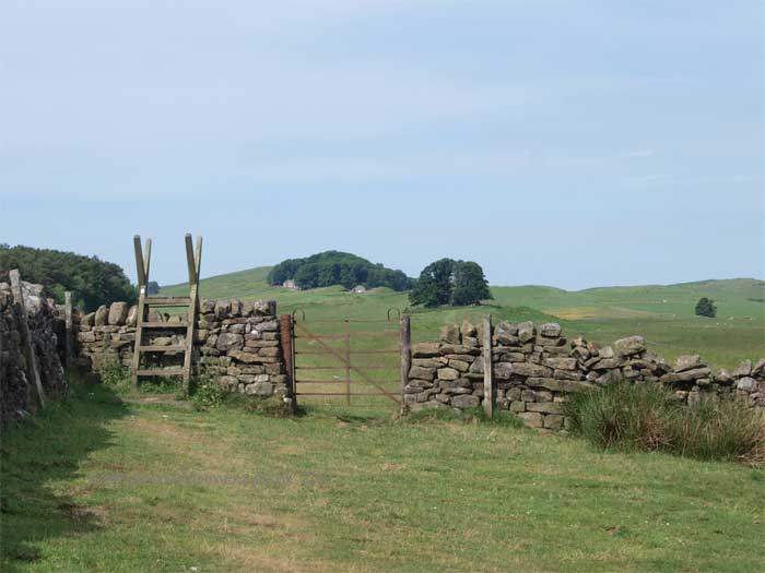 The Wall line runs through the back of the Sewing Shields Farm, built entirely from the stones of the Wall, and can be seen as a ridge running up though the woodland out onto the open Fell.
