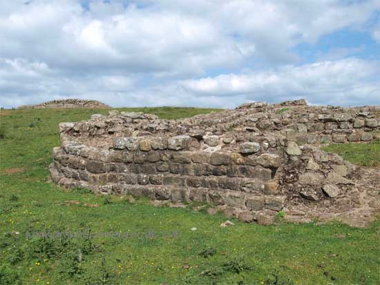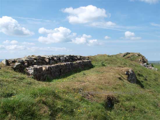 At each Roman mile was a milecastle with a north gate opening through the Wall, surmounted by a defensive turret and a south gate. In the original plan there were two barracks and the milecastle maintained a turret on either hand for the patrol garrison.