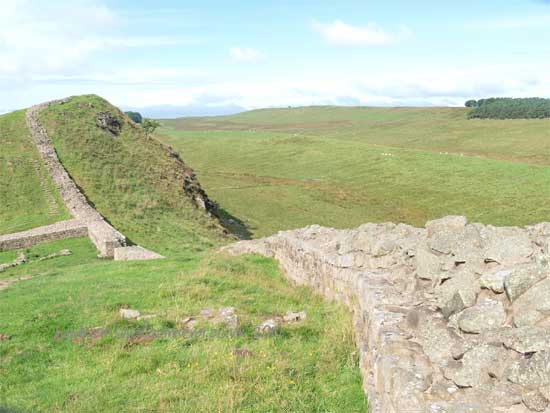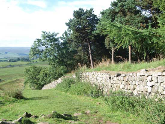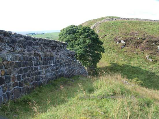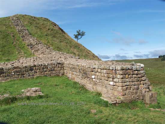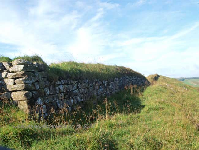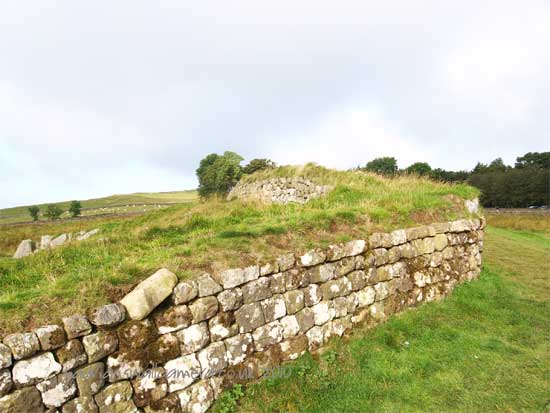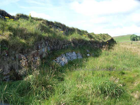 South of the wall was the Vallum, a complex consisting of a 20 ft ditch with a wide bottom section and mounds composed of spoil to north and south. The wall was built to the design width only on the eastern slope. The Milecastles built before the change of plan had 10ft wings on either side. The curtain wall as finally built was substantially narrower and the join is indicated in the diagram.