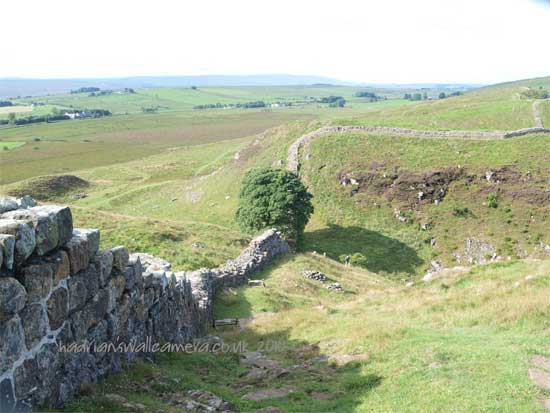 At the Western end of Highshield Crags and before climbing again up onto Steel Rigg the wall drops into the much photographed "Sycamore Gap"