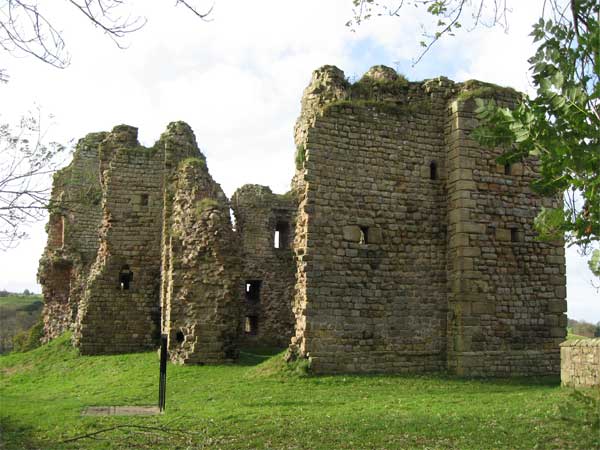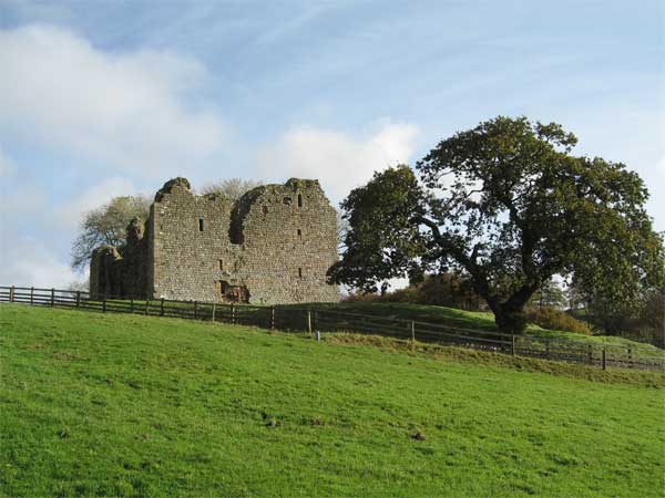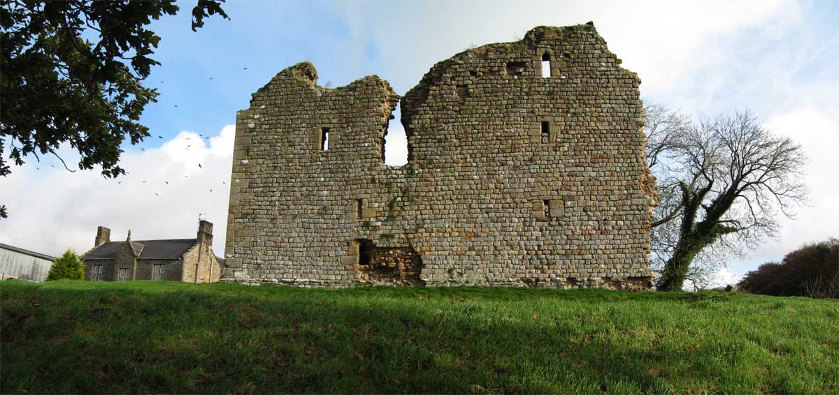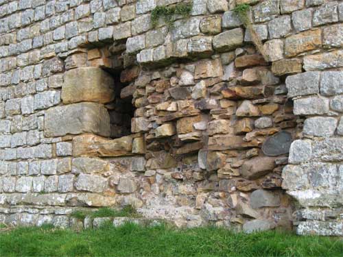 NY 659662/Ruin/Access Thirwall is first mentioned in 1255 the name being derived from " a breach in the wall" i.e. The Roman Wall. The Castle itself is first recorded in 1369 and was probably built a few years earlier. The Mid-C14 castle surviving as a ruined building, is largely built of stone robbed from Hadrian's Wall. It has a Rectangular plan with slightly-projecting north-east tower. 2.5 to 3m thick walls standing to 2 and 3 storeys on north and west; east wall of similar height has partly collapsed at south; south wall has almost entirely collapsed. Fragments of chamfered plinth. North-east tower and corners have huge squared quoins. Scattered loops in flush surrounds with squared alternating jambs. No remains of vaulting. In dangerous condition at time of survey. Mentioned in 1541 as “At Thyrlewall is a toure of thinherytaunce of Rob't Thirlewall of the same in measurable good rep'ac'ons.” The family abandoned the place in the early 17th century but the tower remained in use as a farm until it was slighted by the scots in the 1640s. A visitor c1813 commented that " the great part of it has of late ye`ars been applied to building cottages". The castle has recently been conserved by Northumberland National park. Thirlwell; Thyrlewall; Thirwall; Thirlewall |